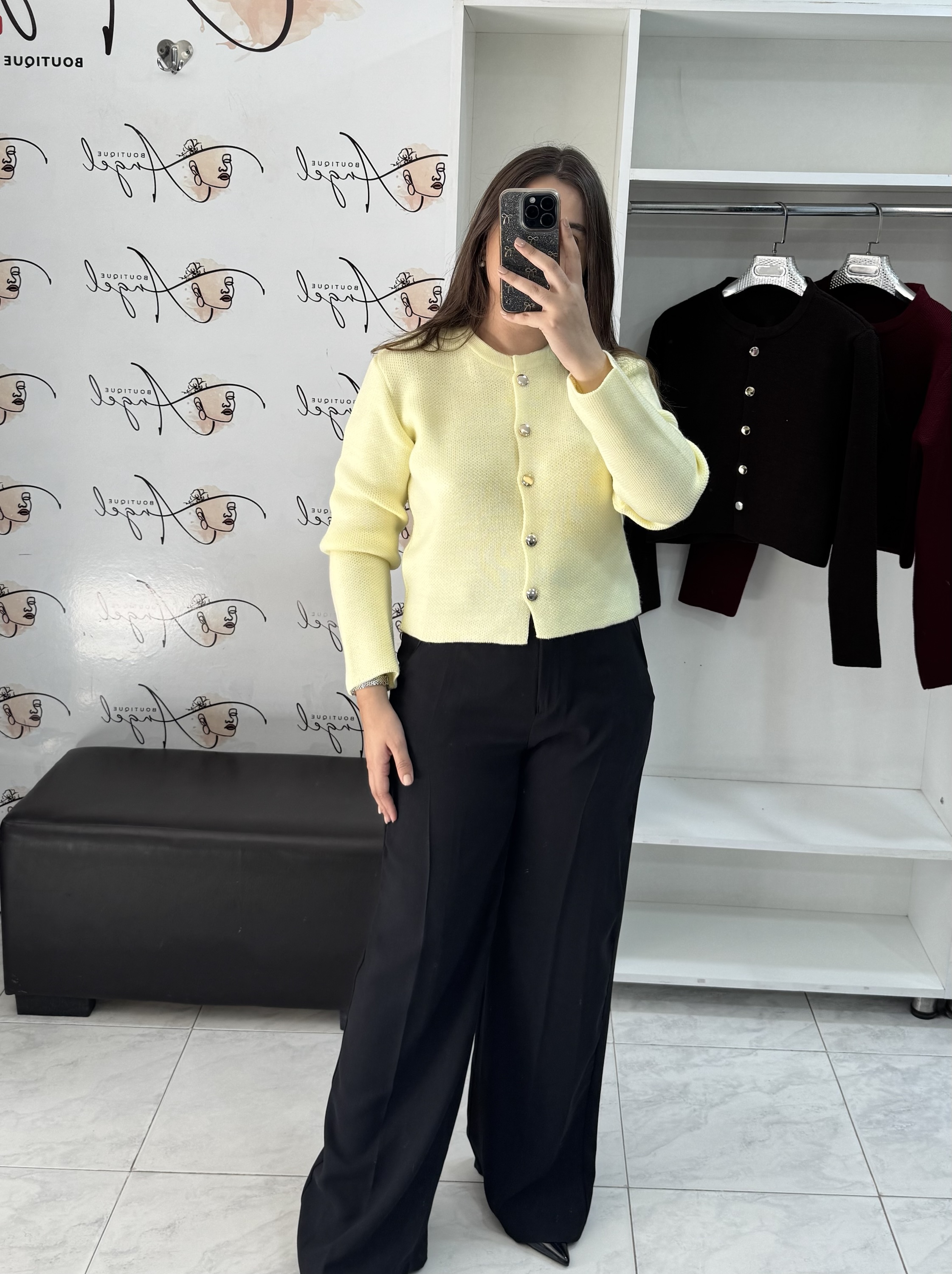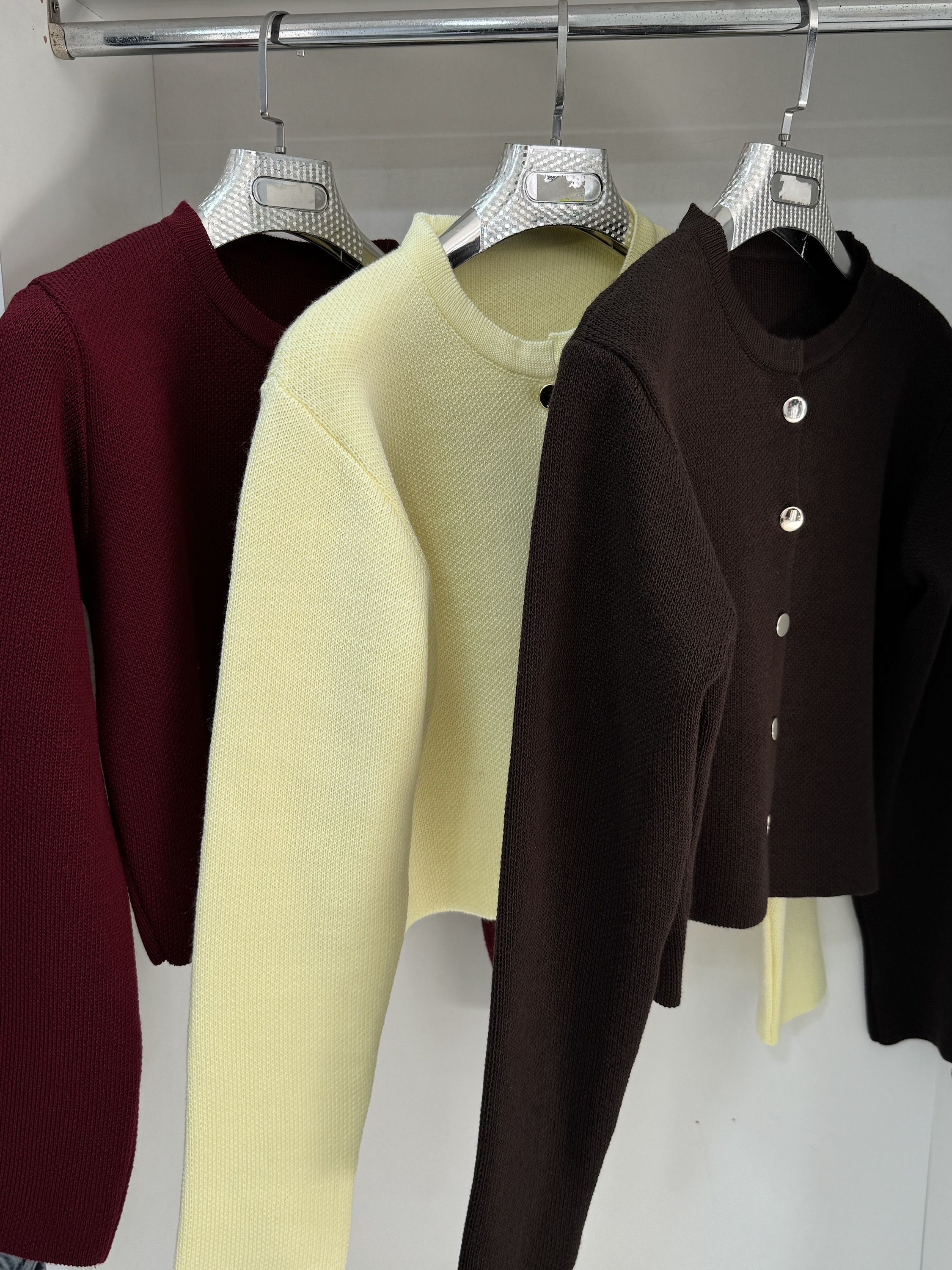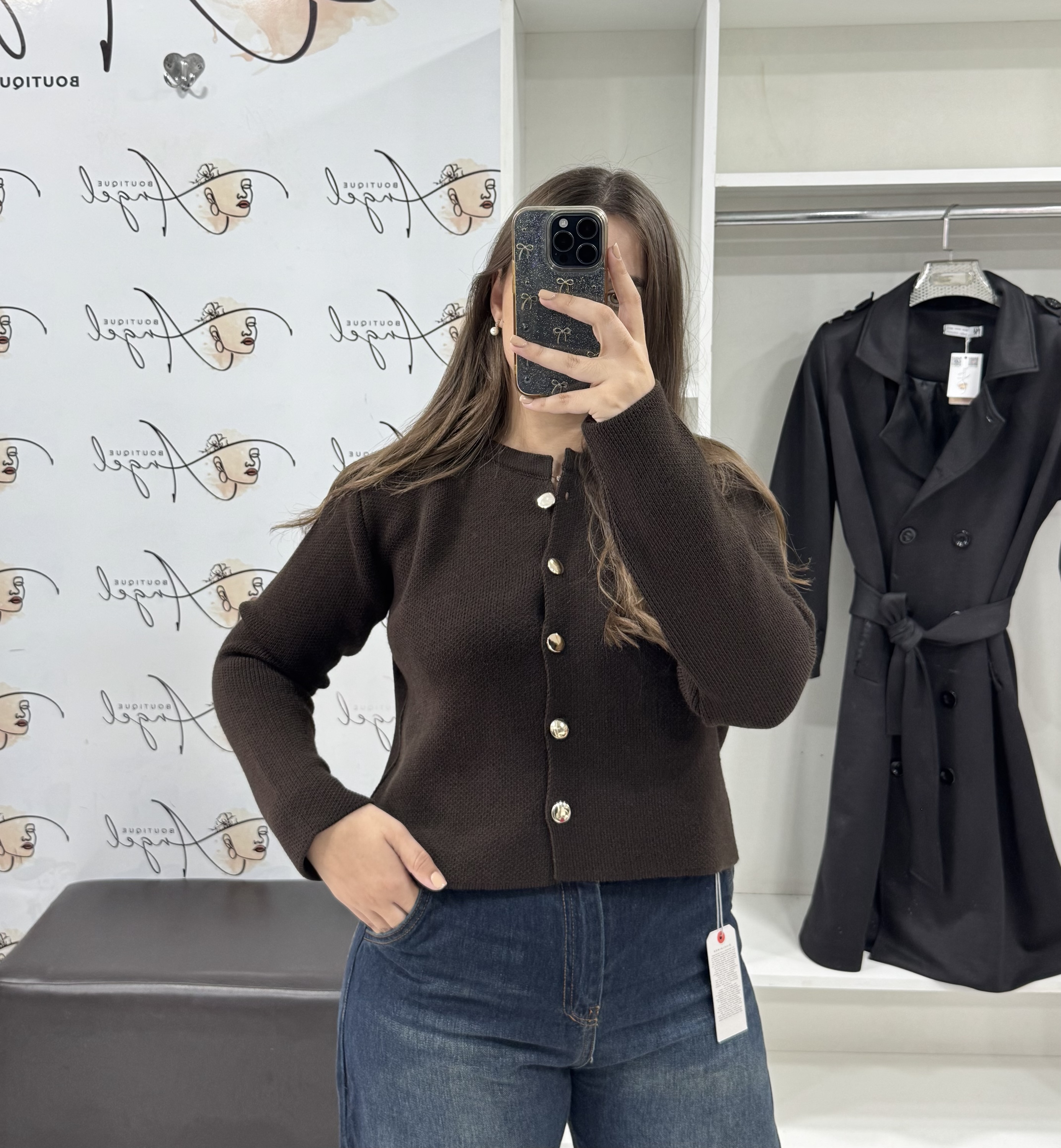 Un joli cardigan en gilet, basique, manches longues, fermeture en boutons en doré, tissu en maille, taille standard