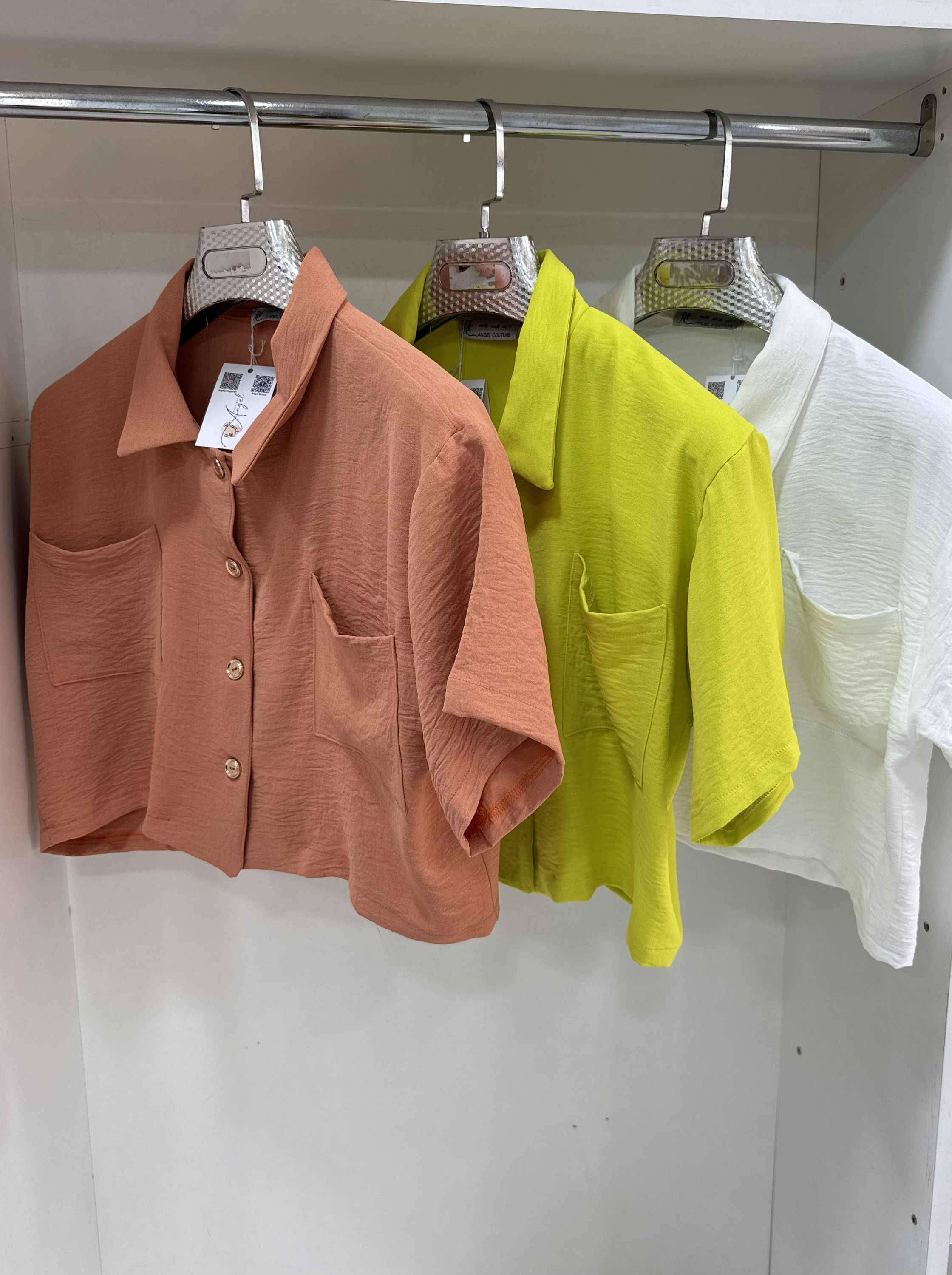 Une jolie chemise cropped, demi manches, a col chemise, fermeture en boutons fines en doré, tissu en crepe froissé