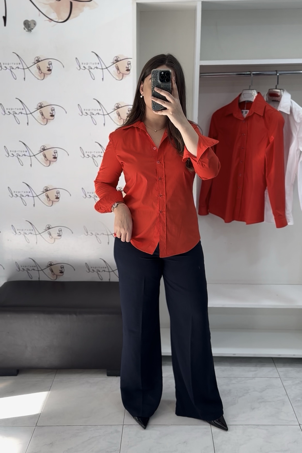 Une jolie Chemise basique,manches longues, coupe polo, fermeture en boutons transparents, tissu en poupeline