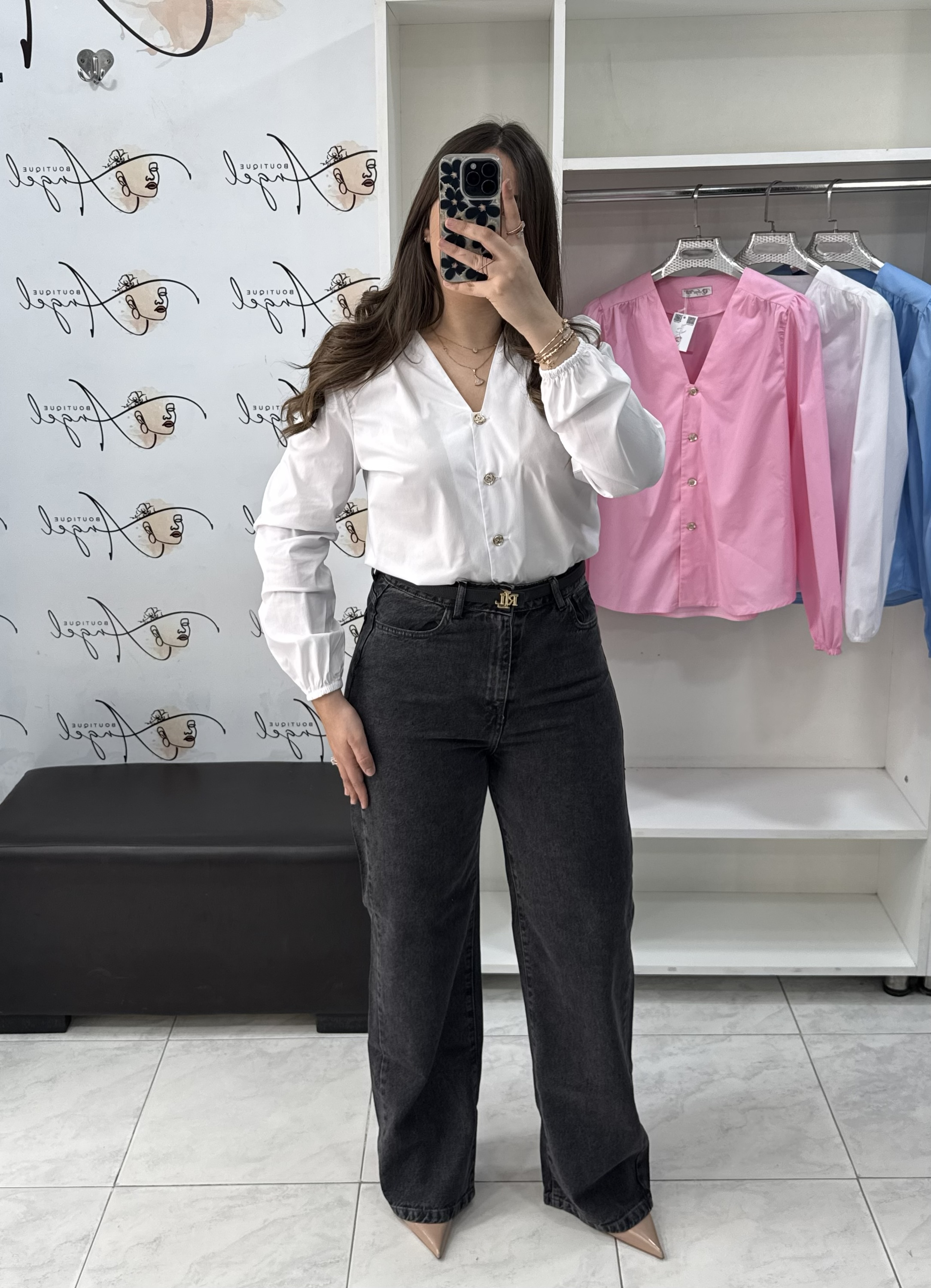 Un joli jean tendance, avec des fines strass en noir, taille haute, excellente coupe