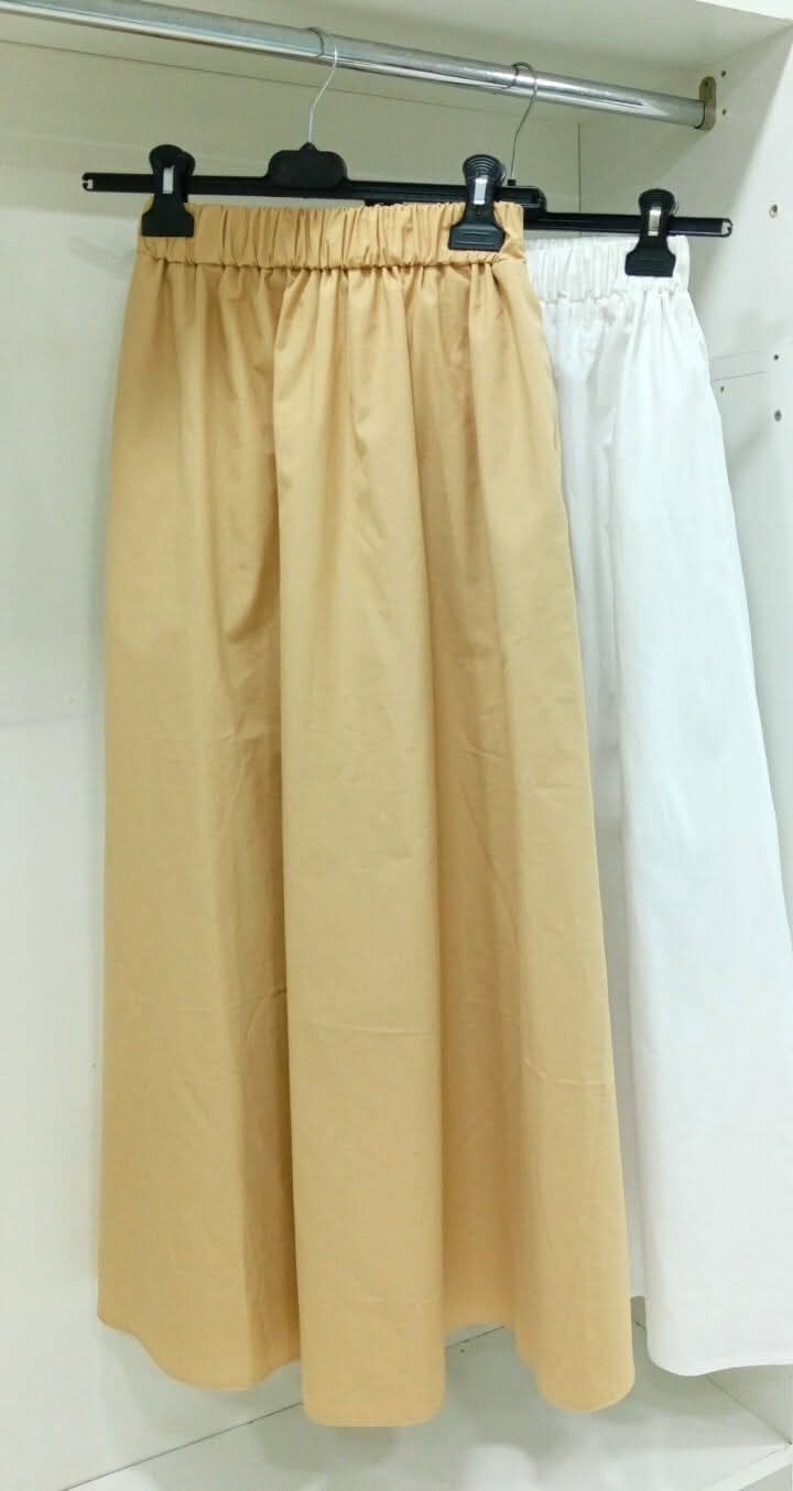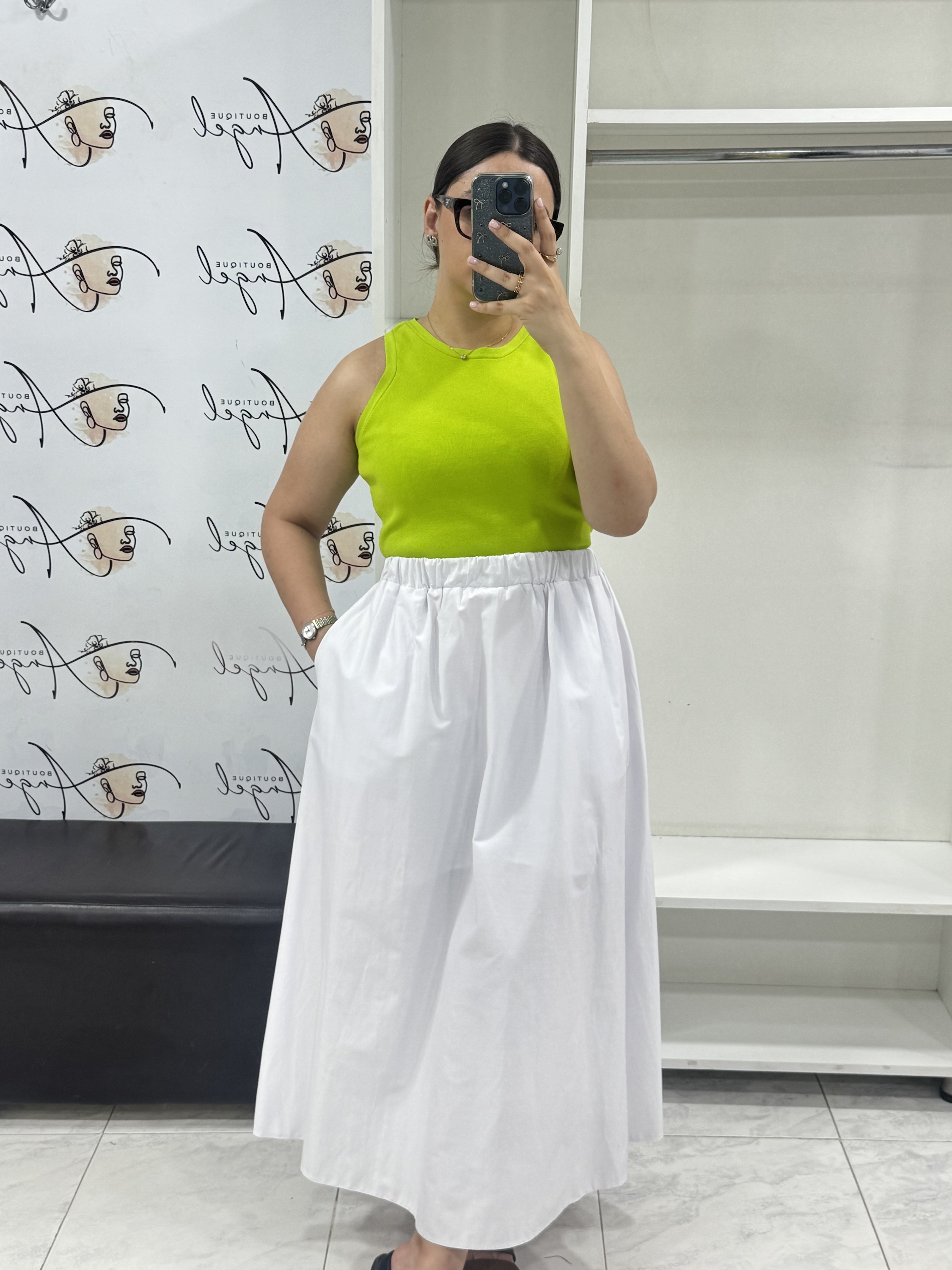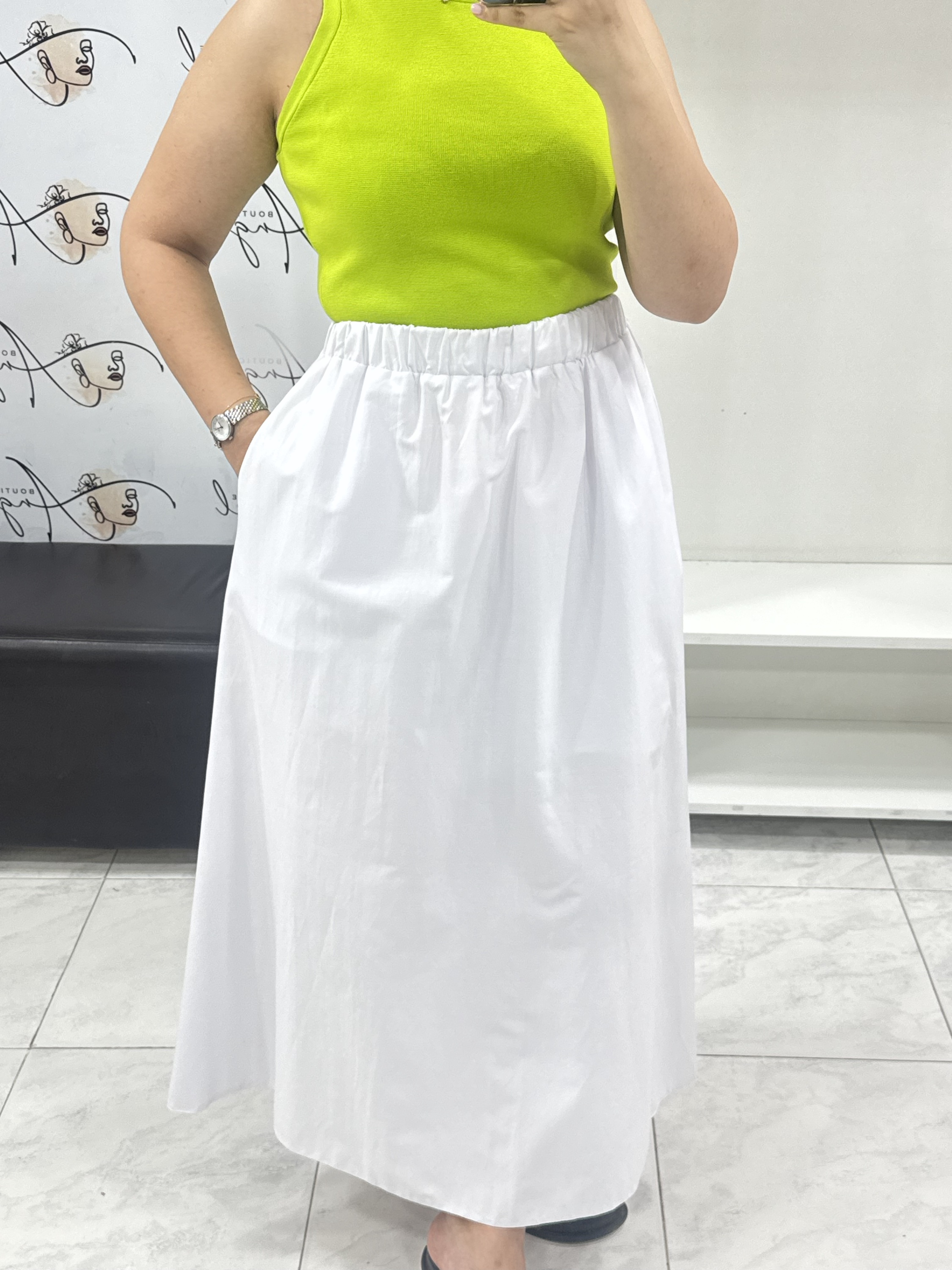 Une jolie jupe longue évasée en blanc, contenant deux poches sur les côtés, taille en elastique, tissu en poupeline, avec un fond de jupe en blanc