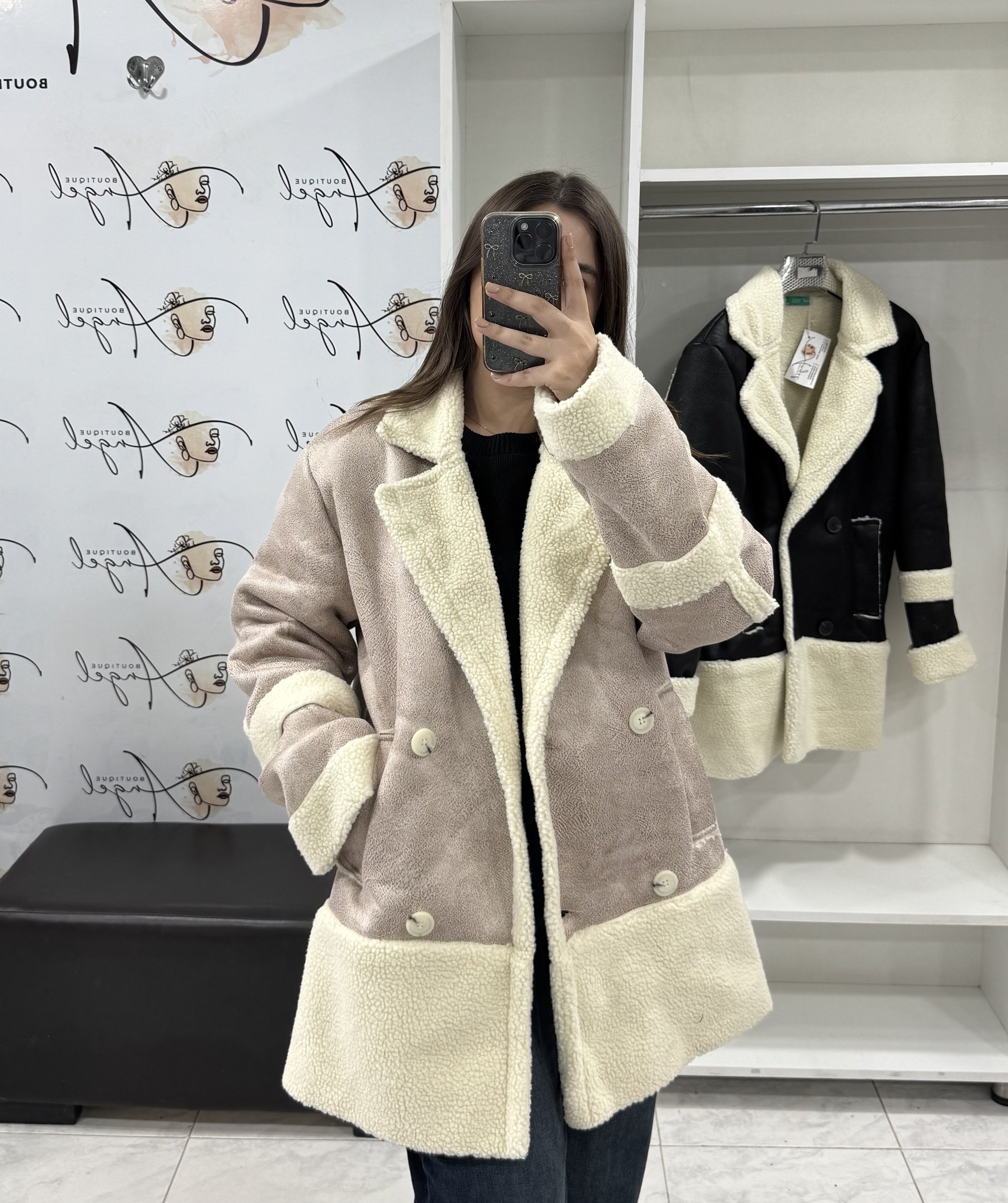 Un joli manteau, tres tendance, mi long, coupe large, tissu composé du daim et intérieur en laine du mouton, confortable, fermeture en boutonnages croisées, super chic!