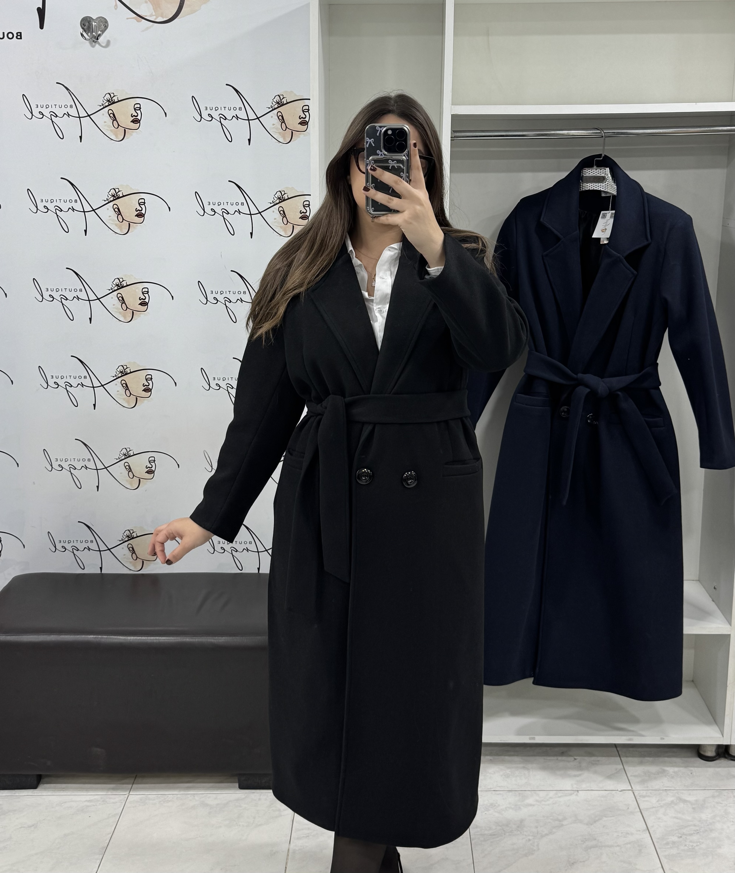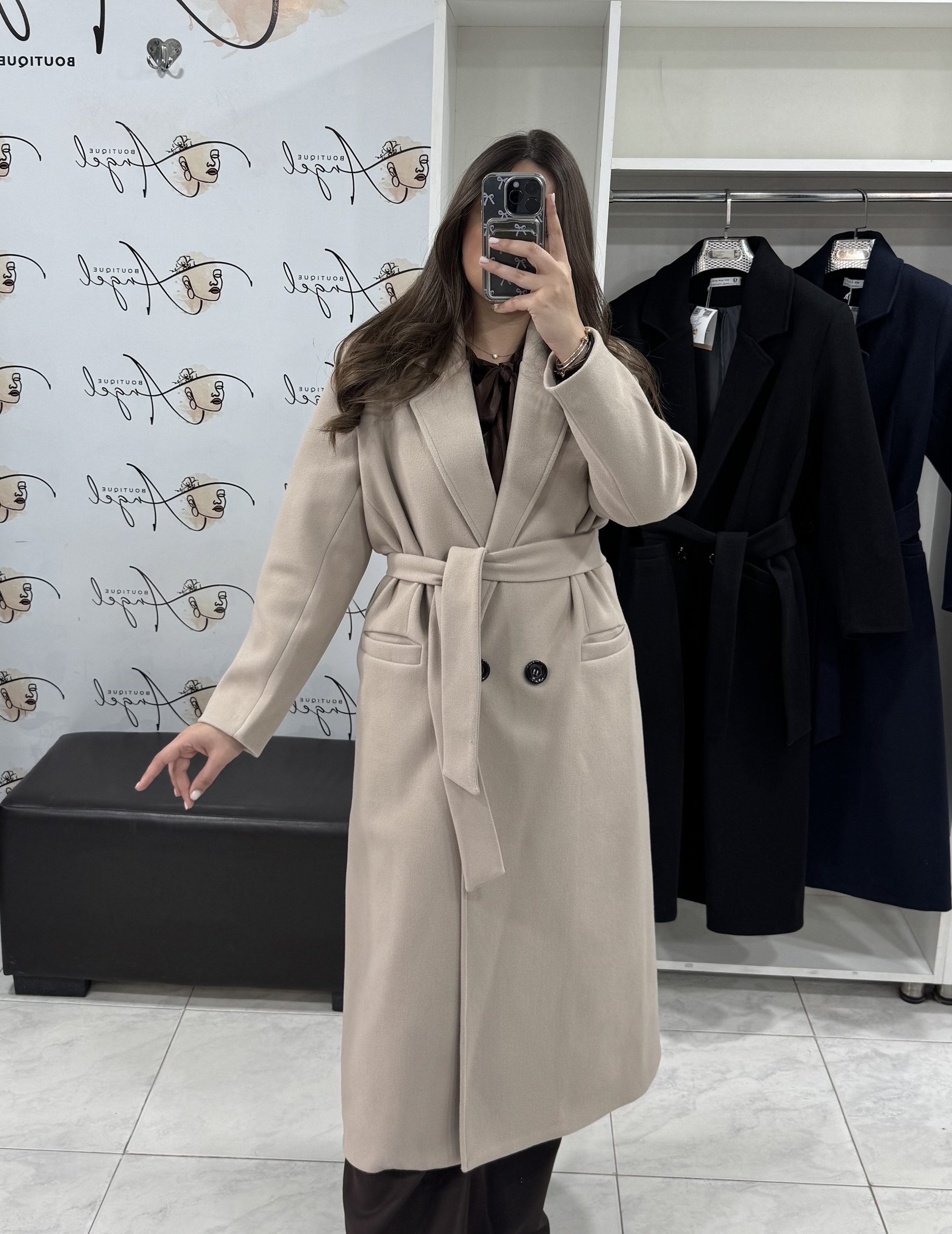 Un joli manteau, long, fermeture a deux boutons avec une ceinture de même tissu en cachemire fine, avec doublure au fond.