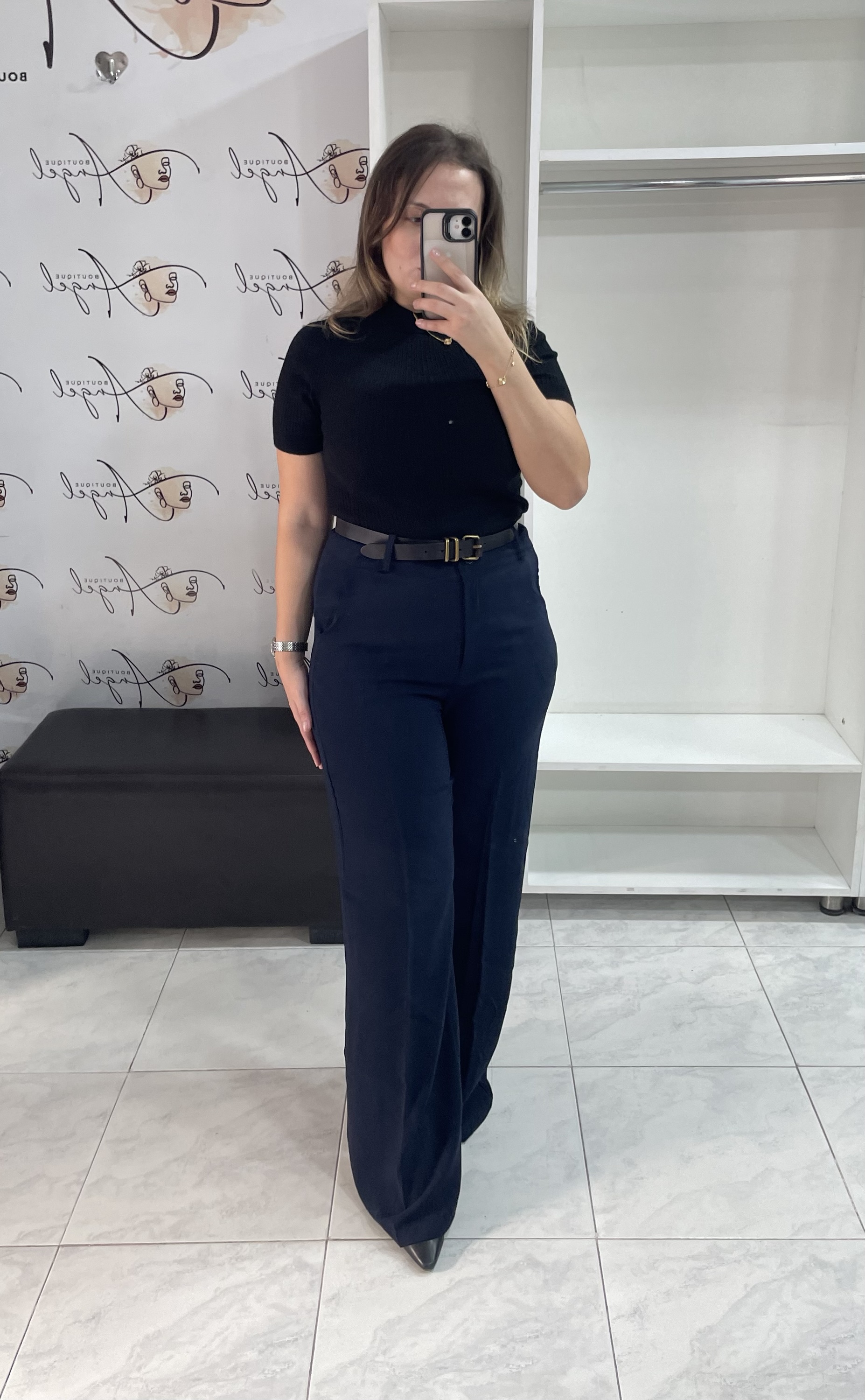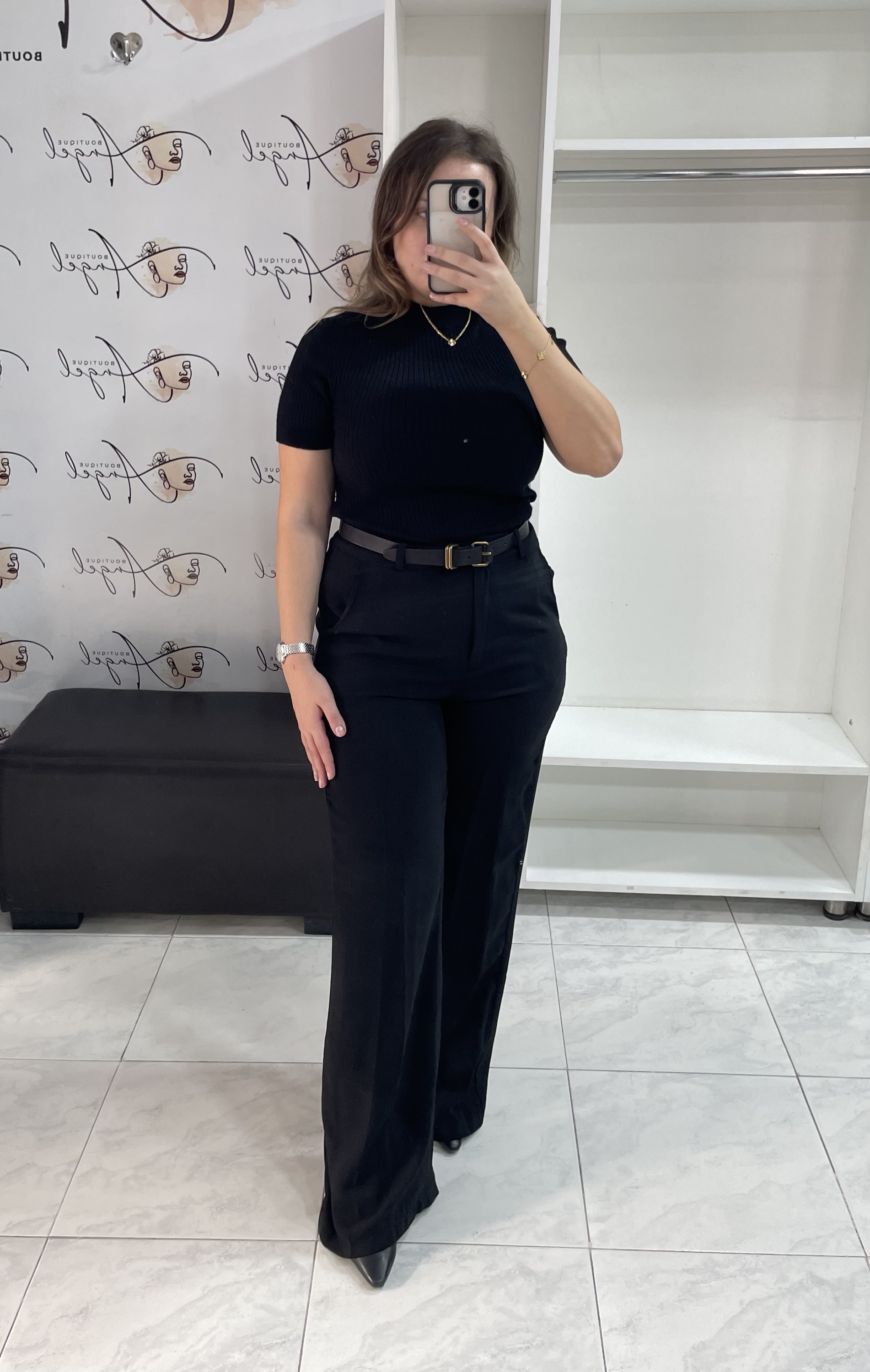 Un joli pantalon basique, de tailles haute, fermeture en un bouton et zip, en excellente qualité deux crepe lamara, hyper fluide, pattes larges, contenant deux poches sur les côtés.