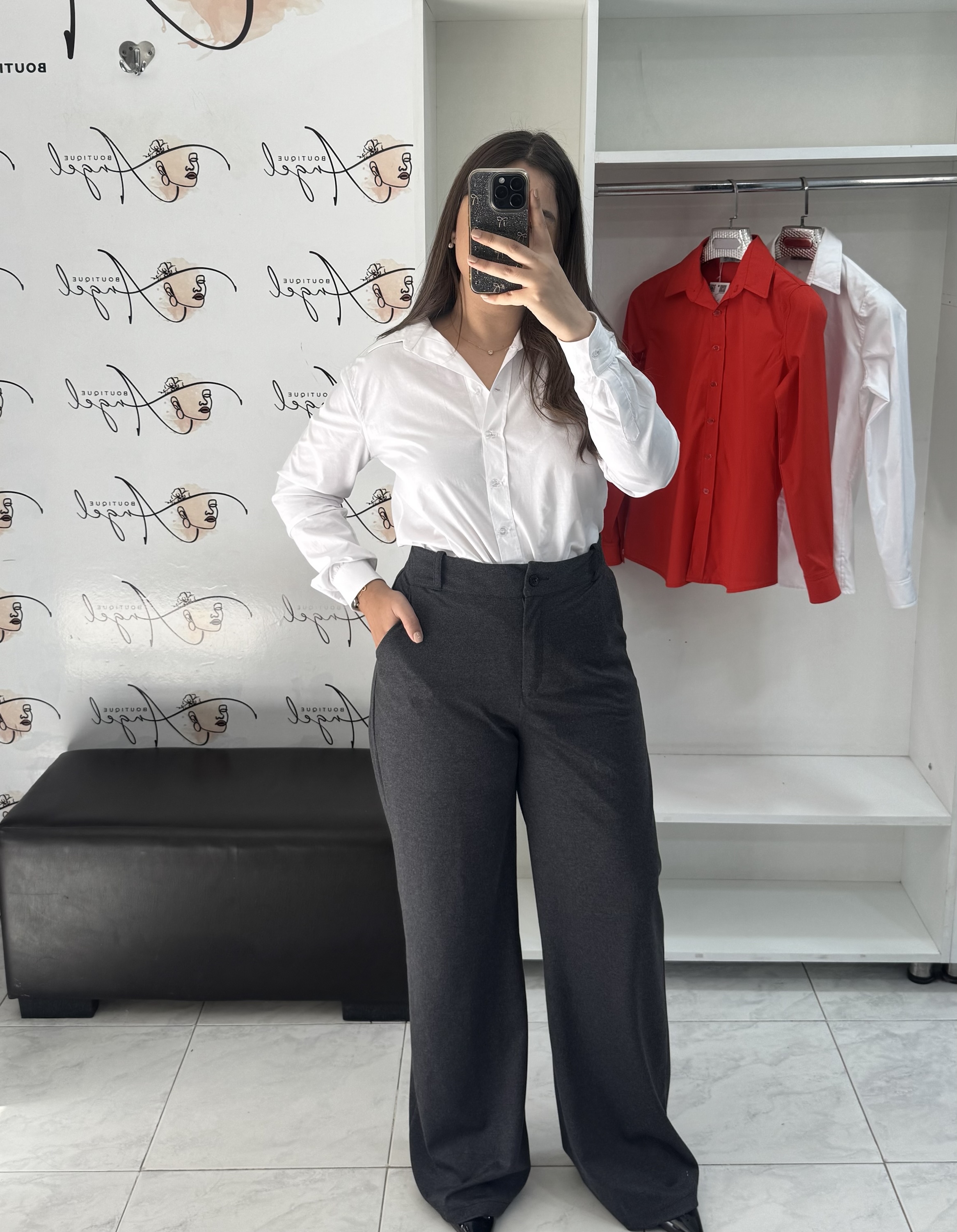 Un pantalon basique, de taille haute, fermeture en un seul bouton et zip, excellente qualité sur lycra, coupe flare, couleur en gris foncé