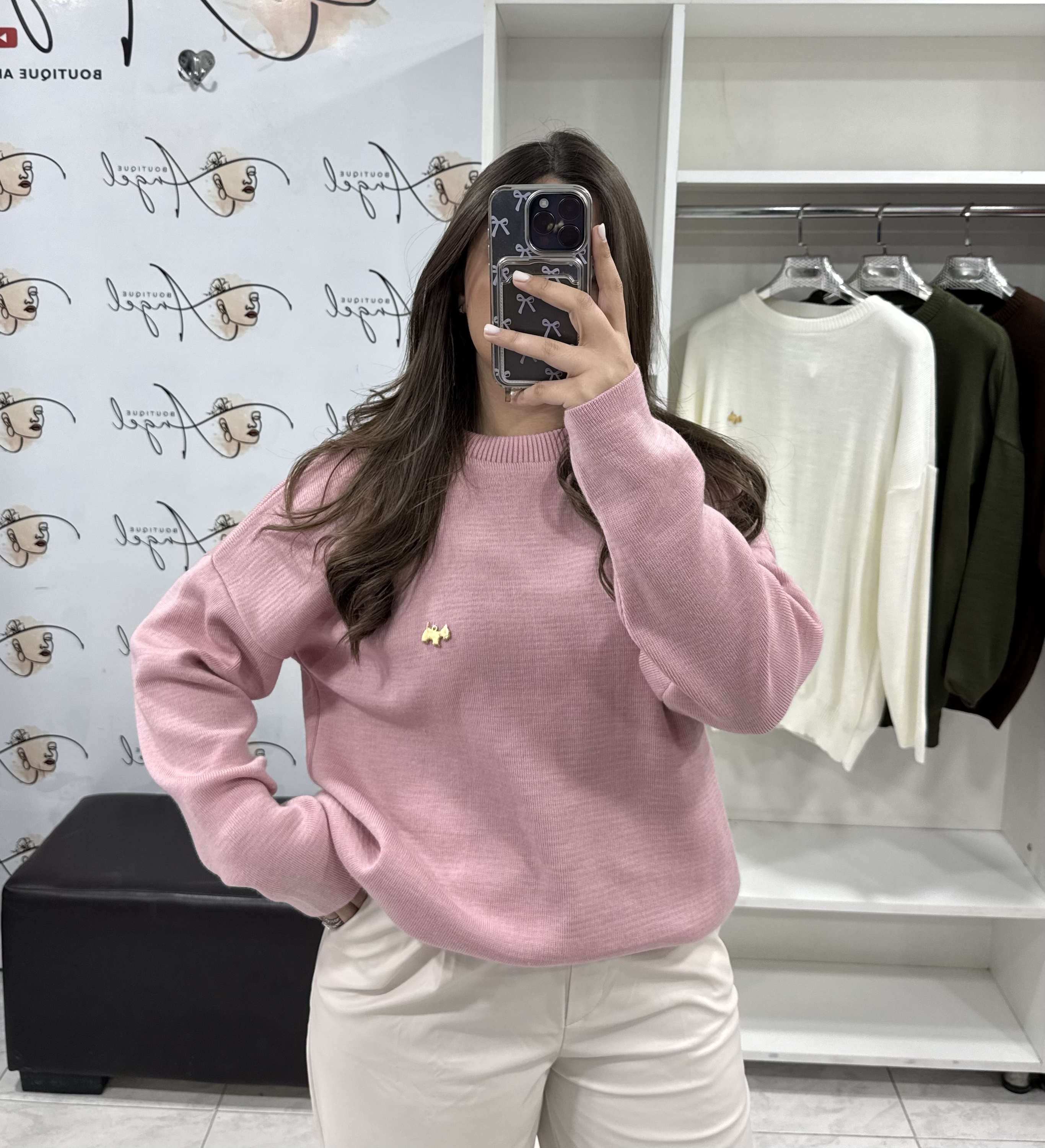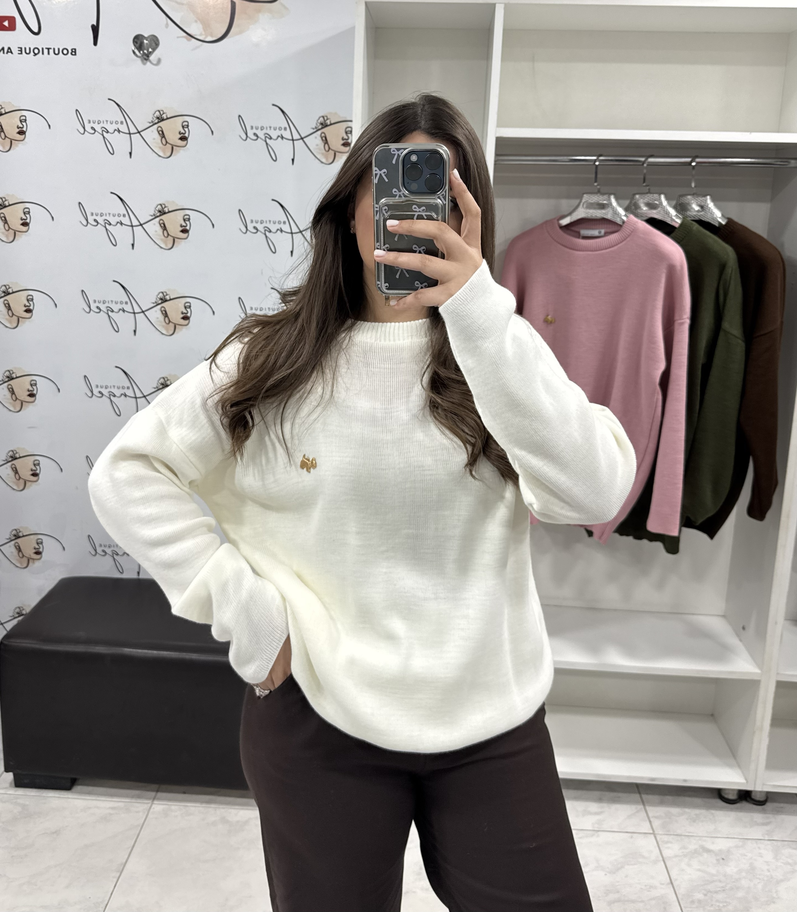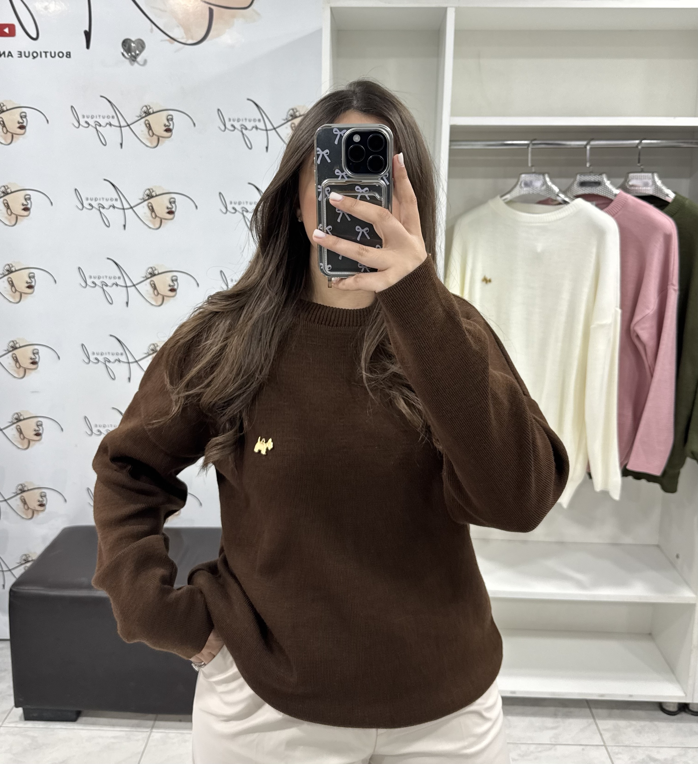 Un joli pull en maille, col rond, manches longues, contenant une fine logo en metal doré, super confortable, de taille standard