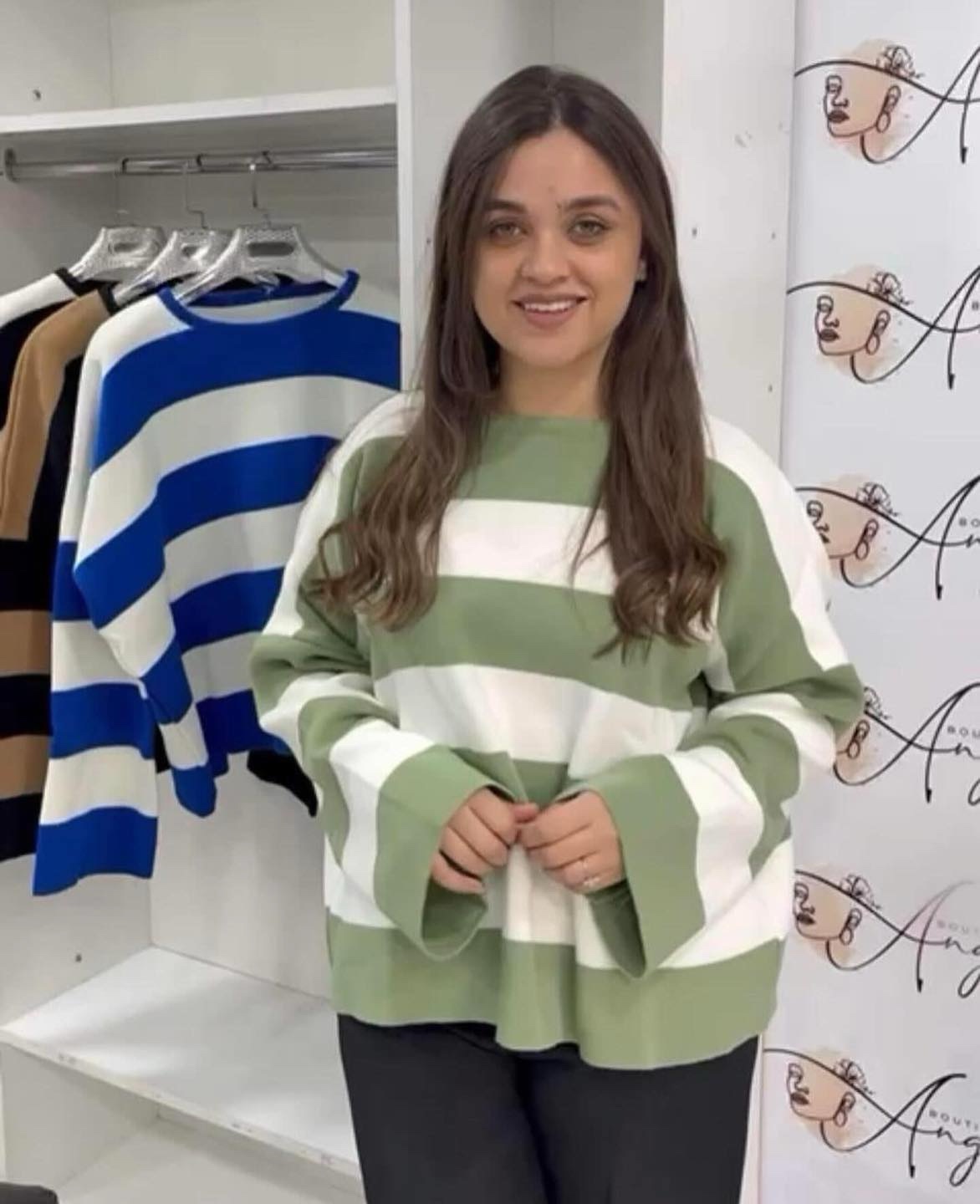 Un joli pull manches longues & larges, contenant des rayures larges bicolore, tissu en laine fine