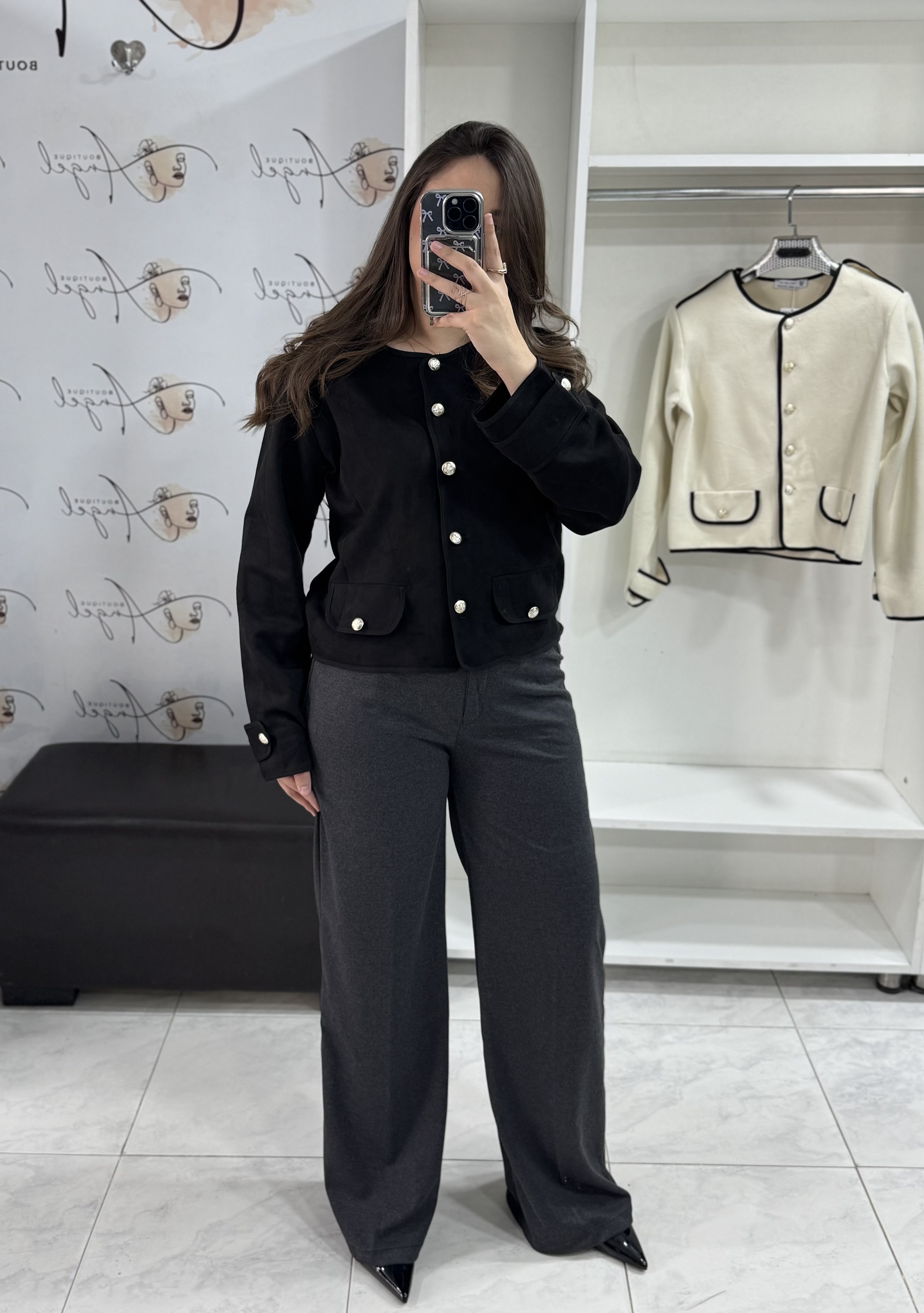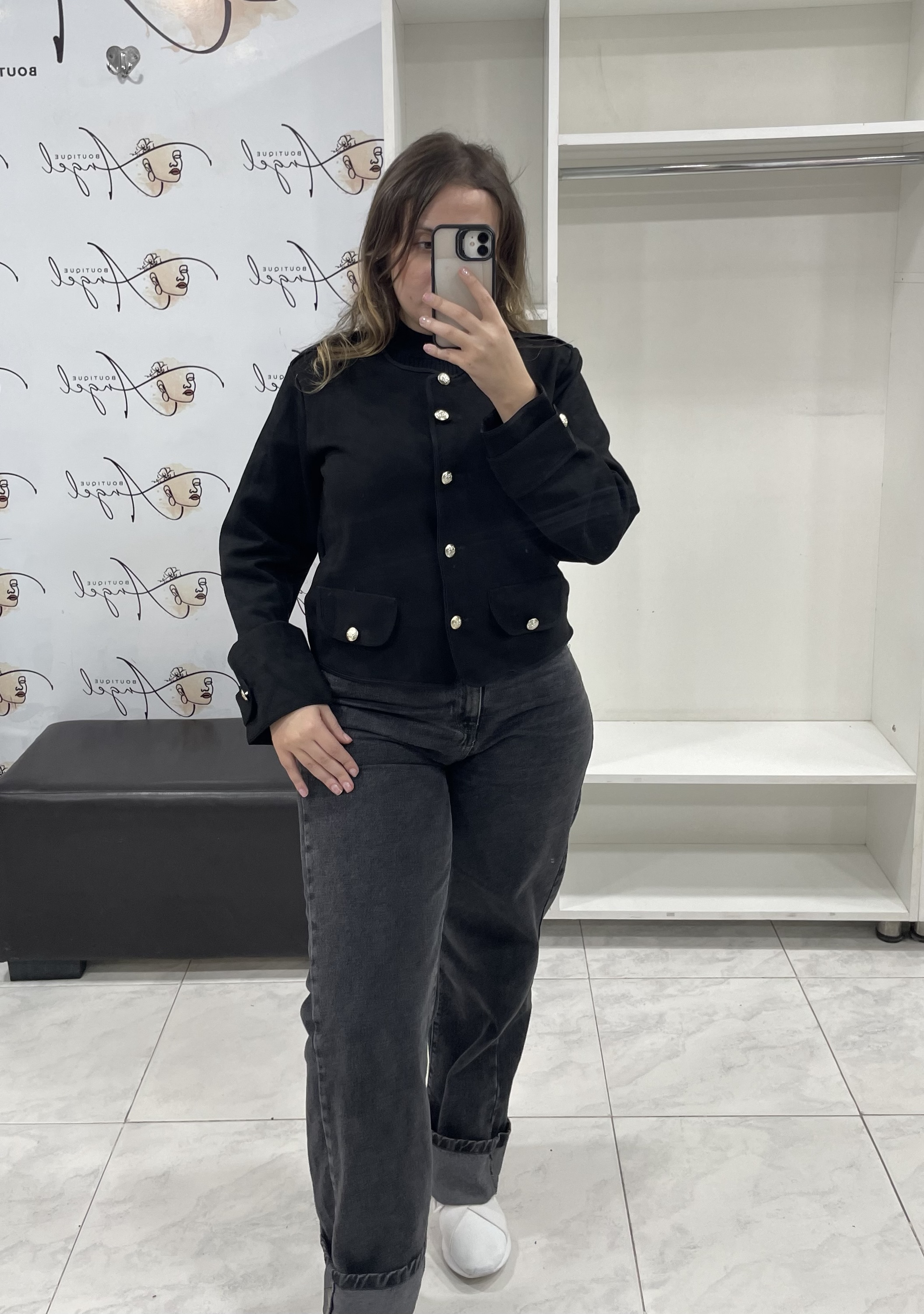 Une jolie veste a la taille, style un peu oversized, les détails de manches en lacets, fermeture en boutons, tissu en daim, de taille standard
