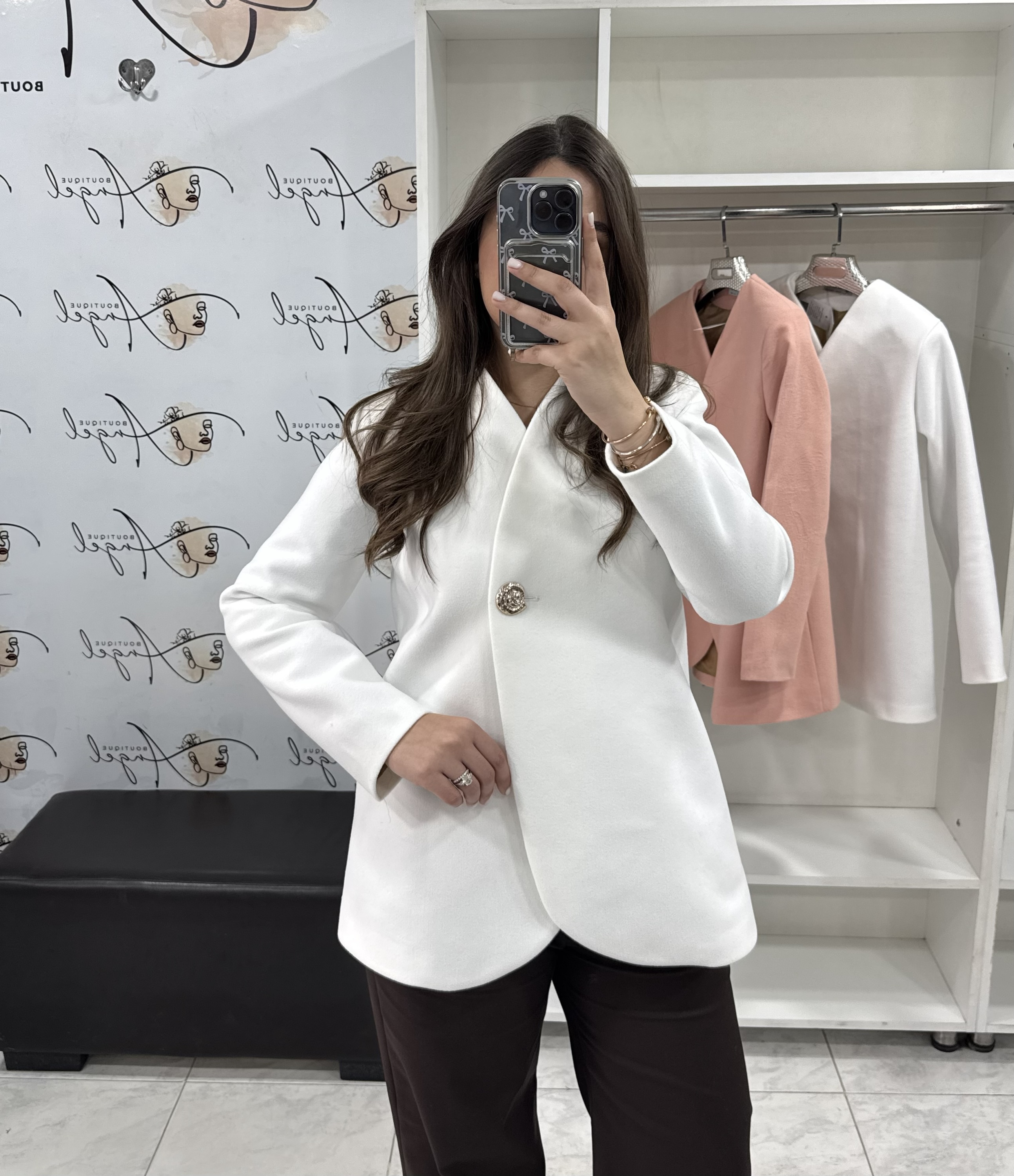 Une jolie veste manteau, en cachemire, contenant une fine fermeture en seul bouton doré en coquillage, trop chic !